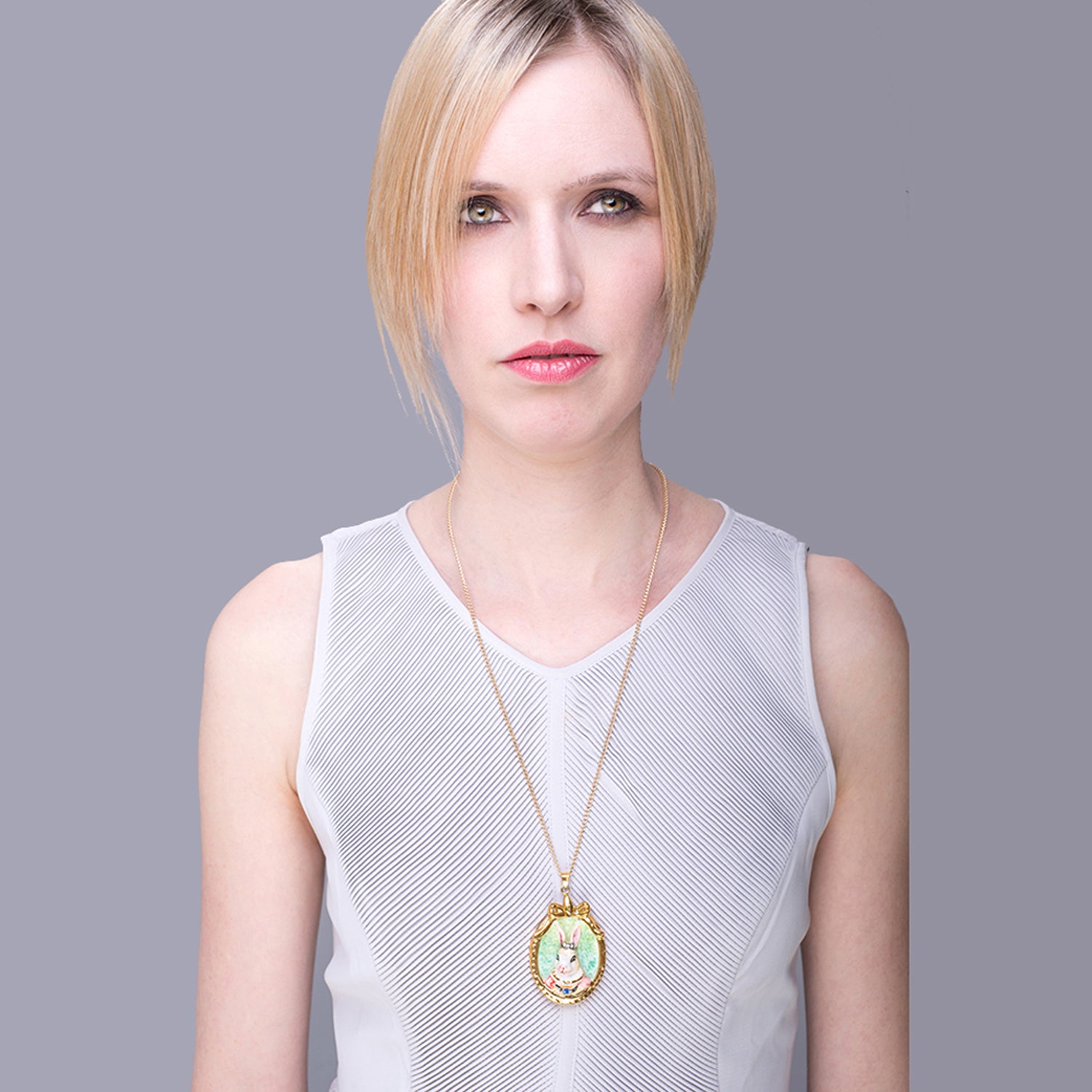 A fabulous rabbit pendant known as Princess Butterscoth is famous in her beauty. Designed and handmade from porcelain in a portrait design. Hand painted with 24ct gold, silver and colour. Embellished with Swarovski crystals for a luxurious touch. Come with 24'' gold plated necklace. Pair it with blouse, shirt or dress to add a cool and chic edge.